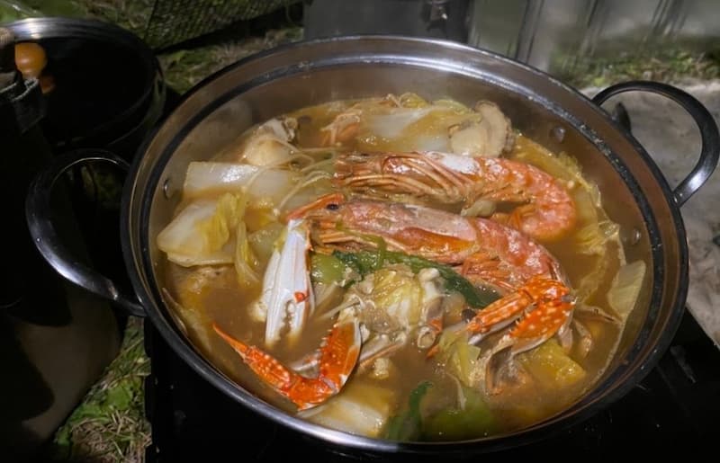 メインの有頭エビ&カニ入り味噌鍋